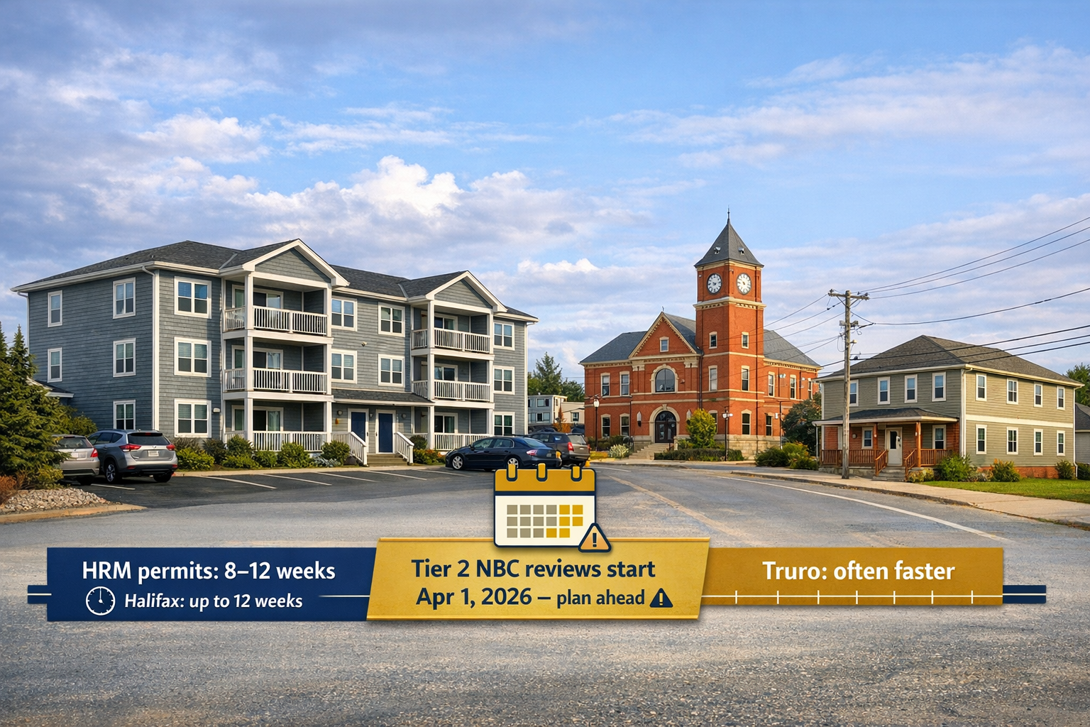 8–12 weeks in HRM (Halifax up to 12w); Truro often faster. Property owners: plan for Tier 2 NBC reviews from Apr 1, 2026 — avoid delays.